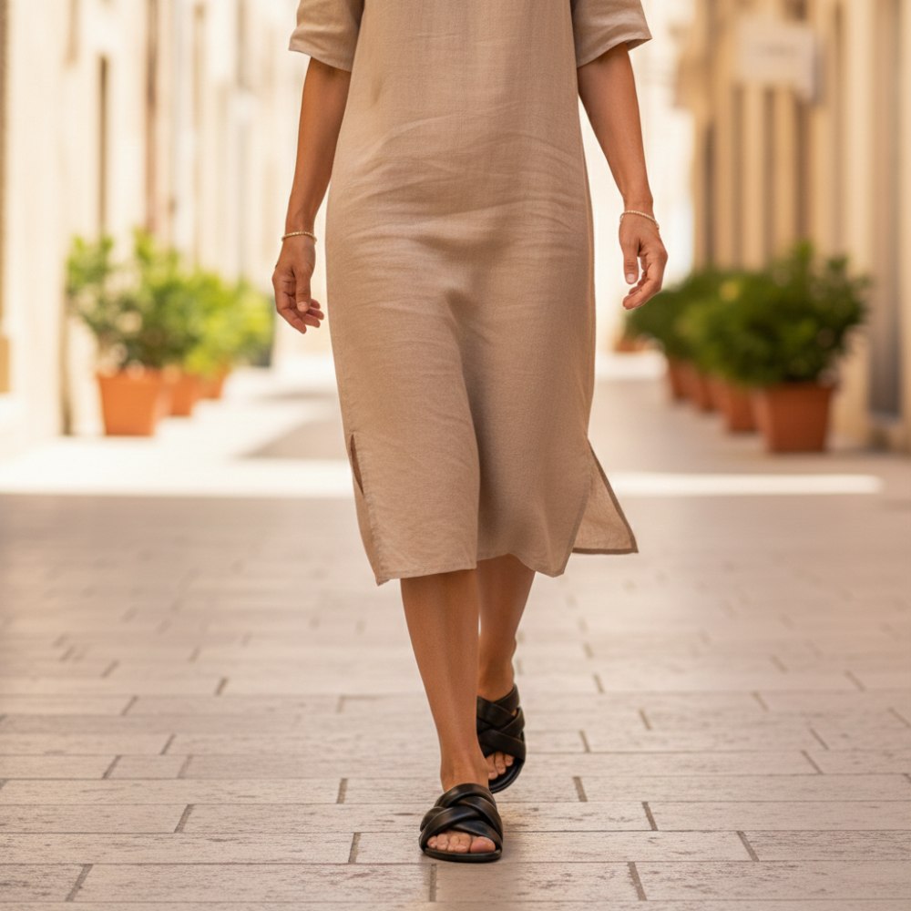 Denne glidesandalen fungerer med den flette stroppen feminin og er så behagelig at hvert trinn blir en glede. På strandpromenaden eller gjennom byen er Alaq der!