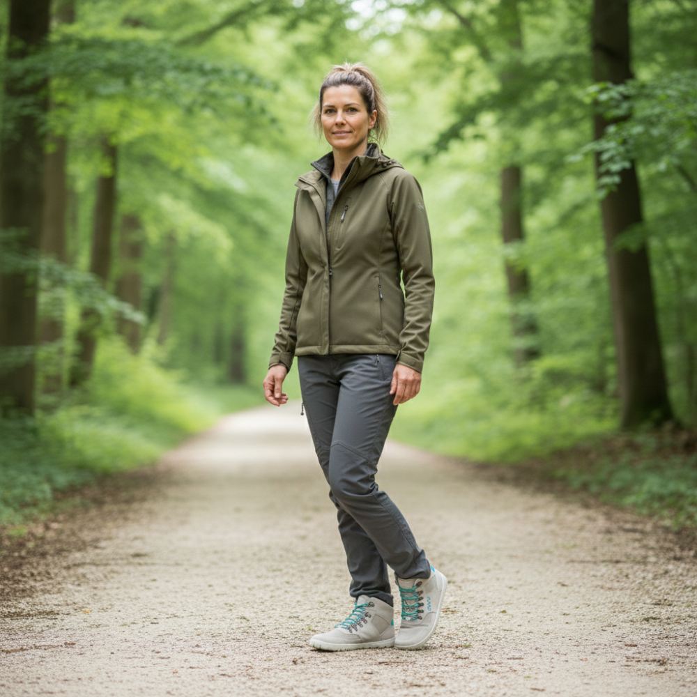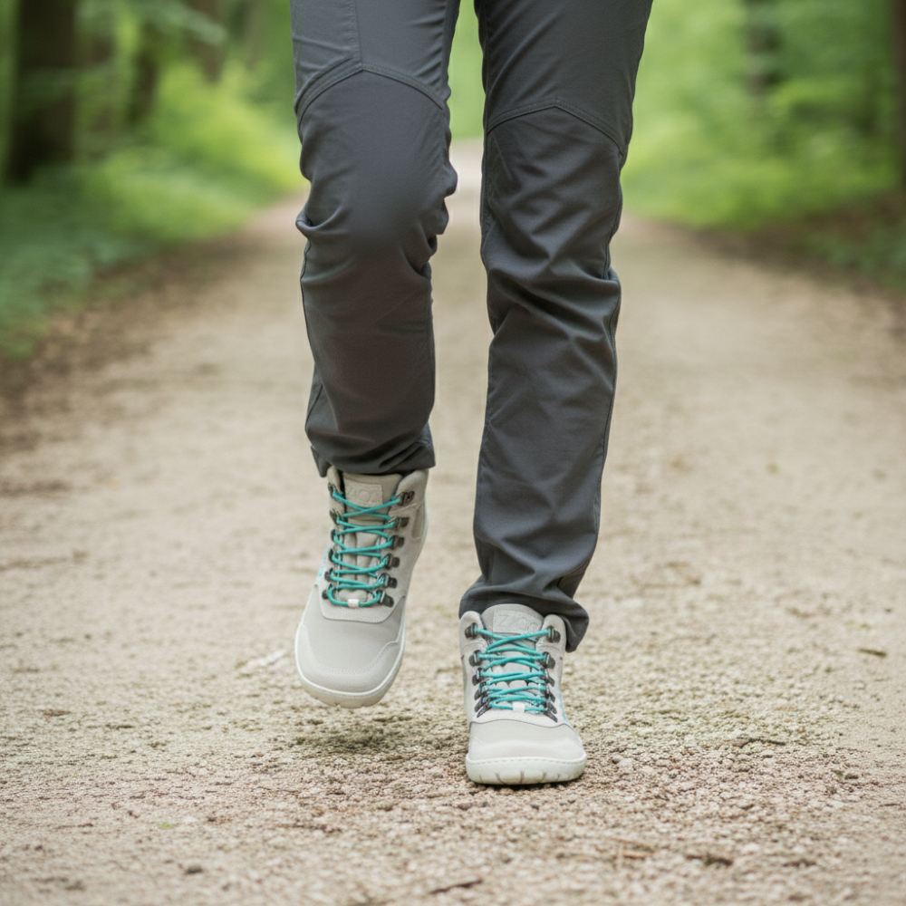 Unter Dir arbeitet eine dünne, hoch flexible Barfußsohle mit Nullsprengung für natürliches Abrollen und eine entspannte, aufrechte Haltung. Der großzügige Zehenbereich schenkt spürbar Freiheit, nichts drückt – auch wenn der Weg länger wird. Das griffige Profil sorgt für sicheren Tritt auf Waldpfad, Schotter oder Stadtpflaster, der gepolsterte Schaft liegt weich am Knöchel und die Hakenösen machen das Schnüren schnell und präzise.