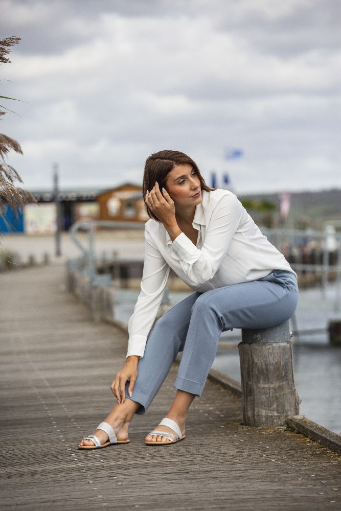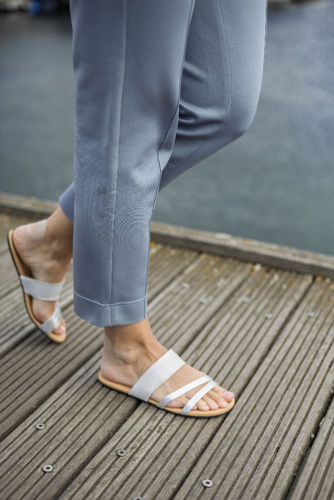 Qate Silver White kombinerer eleganse og den bekymringsløse følelsen av å gå barbeint i en stilig sandal. Deres unike design med to delikate sølvstropper foran og en bredere hvit stropp over spenningen tilbyr ikke bare et øye -fangst, men garanterer også en sikker og behagelig passform. Time Noble Charism passer til forskjellige anledninger.