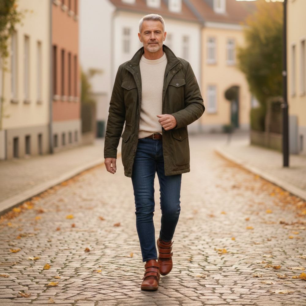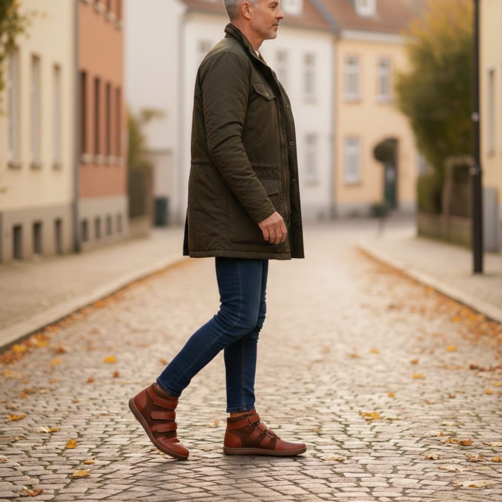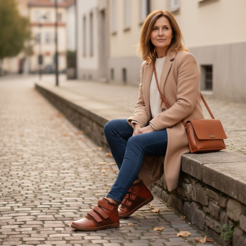 Qooper er den halvhøye barfotskoen, som ser spesielt edel ut på grunn av det brune skinnet og er rett og slett utrolig komfortabel med det praktiske borrelås -festet.