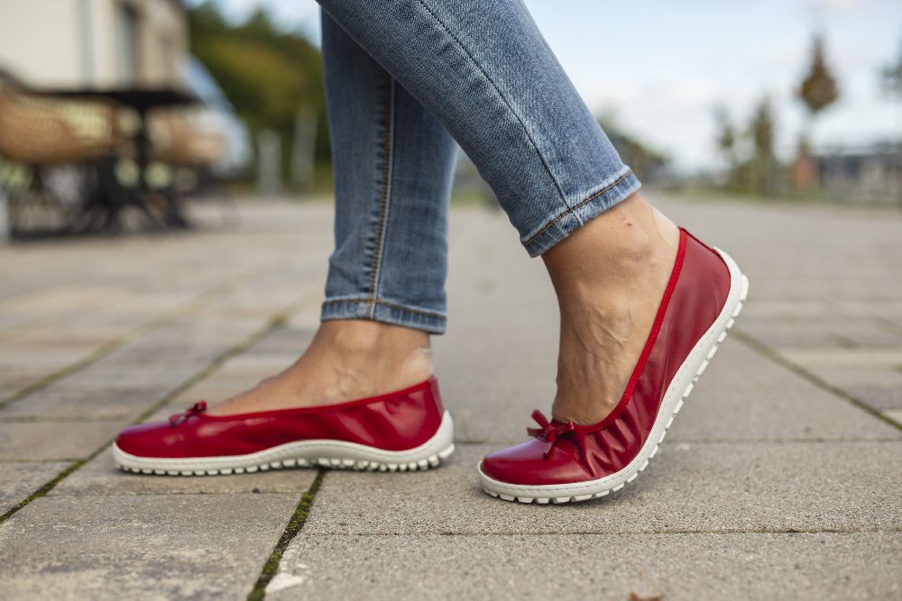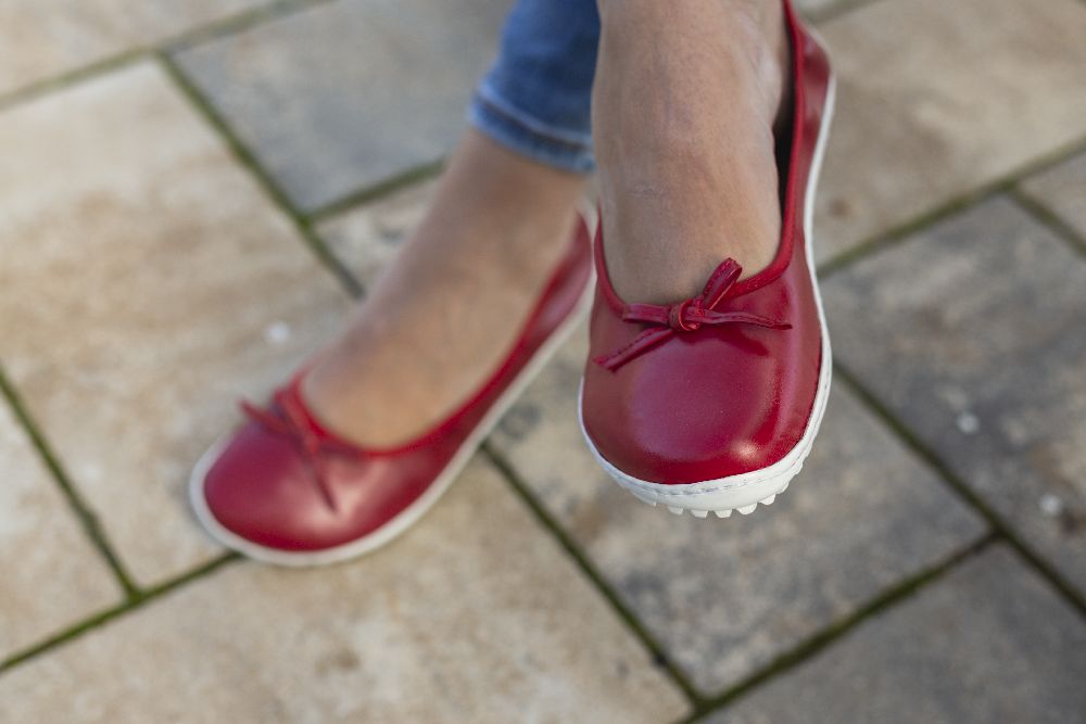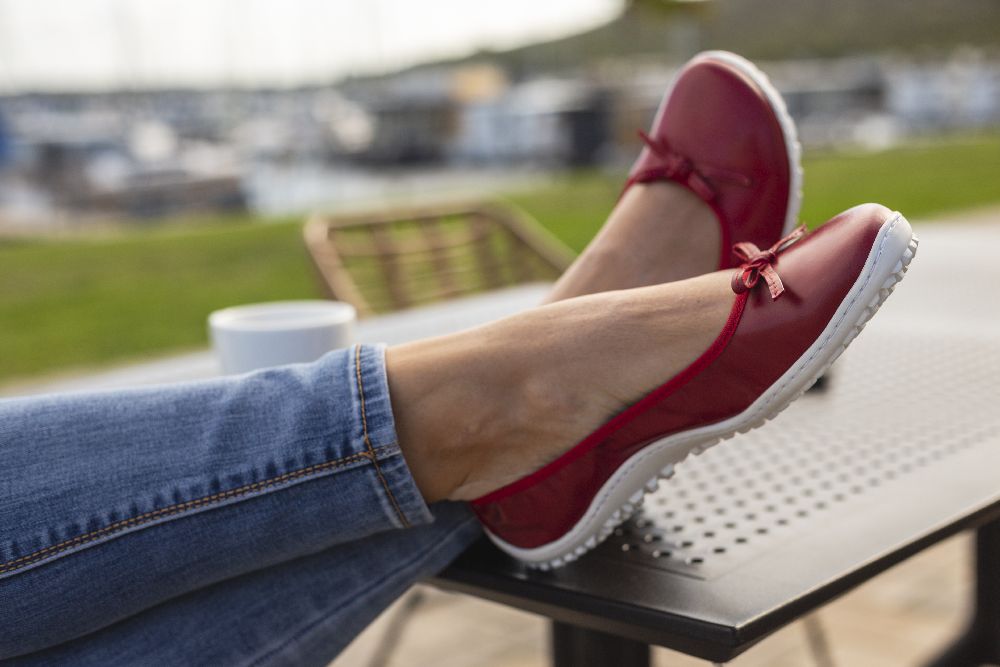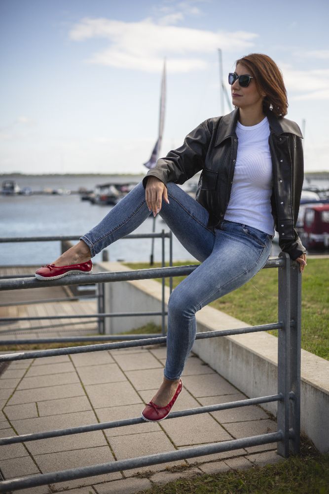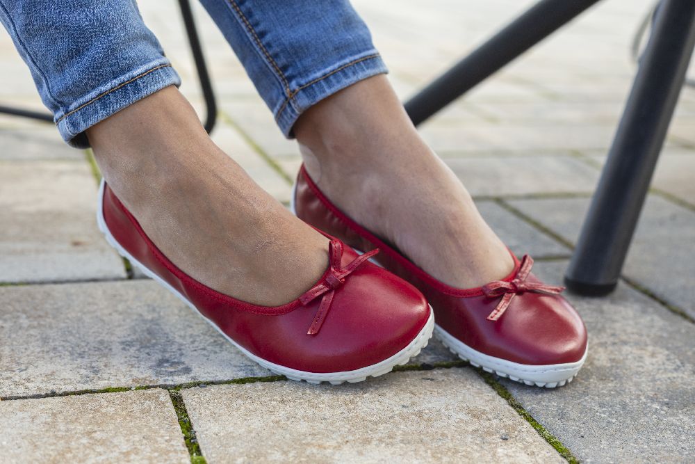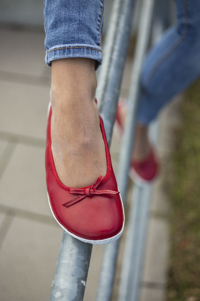 Det fine, mørkerøde glatte skinnet og den subtile sløyfen gir ballerinaen et delikat, feminint utseende. Gjennom den ødelagte sneakeren så det ser han sporty, frisk og moderne ut. Den barfotte sålen sikrer også godt grep og er samtidig så tynn og fleksibel at føttene dine kjenner gulvet med hvert trinn.